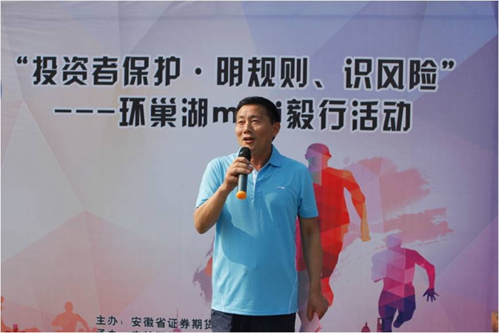 上午八點(diǎn)二十,濱湖新天地廣場上人頭攢動(dòng)、旌旗招展,參加此次活動(dòng)的全體員工在這里集合完畢?;顒?dòng)開始前,安徽省證券期貨業(yè)協(xié)會副會長、秘書長鐘自木代表協(xié)會致辭。