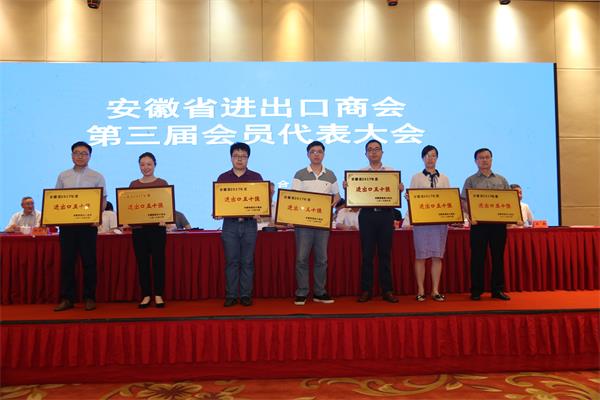 2018年6月21日,安徽省進(jìn)出口商會(huì)第三屆會(huì)員代表大會(huì)在合肥天鵝湖大酒店召開,會(huì)上發(fā)布了《2017年安徽省進(jìn)出口排行榜》并對(duì)“2017安徽省進(jìn)出口總額50強(qiáng)企業(yè)”進(jìn)行了授牌。