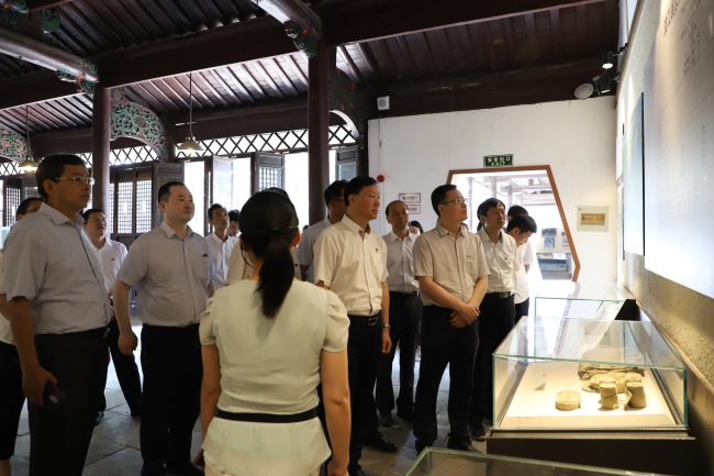 在瑤崗渡江戰(zhàn)役總前委舊址,黨員同志們在現(xiàn)場講解員的帶領下,認真觀看渡江戰(zhàn)役紀錄片,細致瀏覽一張張泛黃的歷史照片和珍貴的文獻實物,仔細端詳著陳舊卻依舊閃光的戰(zhàn)斗槍支、大刀和一件件浸潤著先烈血汗的棉褥、草鞋,在生動的講述中,感受70年前那段慷慨激昂、艱苦卓絕的革命歲月。