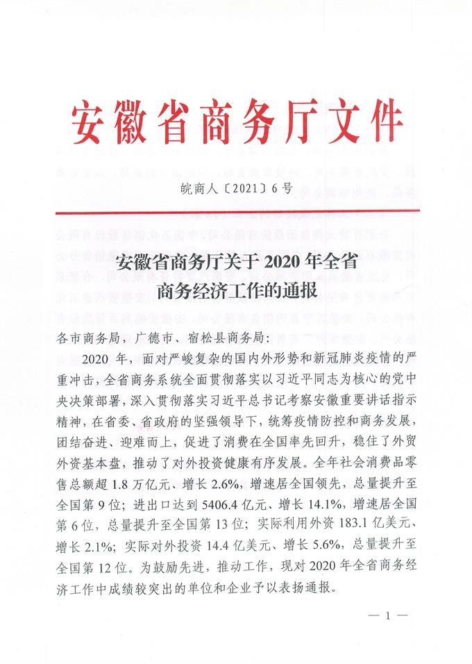 全省商務(wù)工作電視電話會議2021年1月21日上午在合肥召開。會上,省商務(wù)廳張箭廳長對2020年全省商務(wù)經(jīng)濟(jì)工作中成績較突出的單位和企業(yè)予以表揚(yáng)通報(bào)。