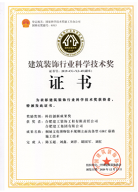 自2019年評(píng)選以來(lái),公司申報(bào)的“安徽(中國(guó))桐城文化博物館”項(xiàng)目斬獲科技創(chuàng)新工程獎(jiǎng)一項(xiàng),總結(jié)形成的施工技術(shù)成果“不規(guī)則立面齒條型GRC幕墻施工技術(shù)”獲得科技創(chuàng)新成果獎(jiǎng)一項(xiàng),走在安徽省內(nèi)裝飾行業(yè)的前沿。之后相繼獲得兩項(xiàng)科技創(chuàng)新工程獎(jiǎng):合肥市第六十八中學(xué)改擴(kuò)建項(xiàng)目-綜合樓工程,六安市兒童醫(yī)院、金安區(qū)婦幼保健院醫(yī)療病房綜合樓裝飾裝修工程;兩項(xiàng)科技創(chuàng)新成果獎(jiǎng):“一種可開(kāi)啟180度的裝飾消火栓暗門(mén)”,“ 基于3D建模技術(shù)高支模結(jié)構(gòu)與裝飾結(jié)構(gòu)共用盤(pán)扣腳手架安裝技術(shù)”。其中“一種可開(kāi)啟180度的裝飾消火栓暗門(mén)”科技創(chuàng)新成果更是獲得一等獎(jiǎng)的好成績(jī)。
