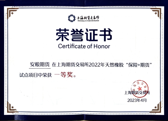 近日,上海期貨交易所對2022年天然橡膠“保險+期貨”試點項目進行結(jié)項評審,安糧期貨在海南省樂東黎族自治縣開展的“保險+期貨”項目中表現(xiàn)優(yōu)異,榮獲2022年天然橡膠“保險+期貨”試點項目一等獎。